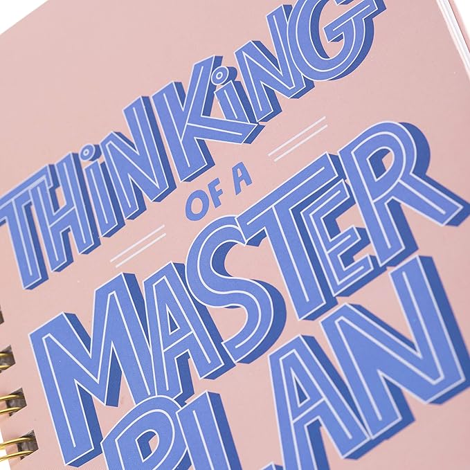 - GENUIS AT WORK A bright pink and blue hand lettered design by artist Emily Dumas features the saying THINKING of a MASTER PLAN. Get your juices flowing with great ideas! Personal thoughts, sketches, work reminders, homework, and more, this notebook will protect all your entries. Writing in this fun journal will keep you inspired throughout your day.