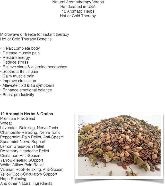 - ALL NATURAL - 100% Natural herbs and flax seed, microwave heating pad Filled with 12 natural herbs and other aromatic ingredients - Made in the USA from soothing natural herbs like lavender and others.
