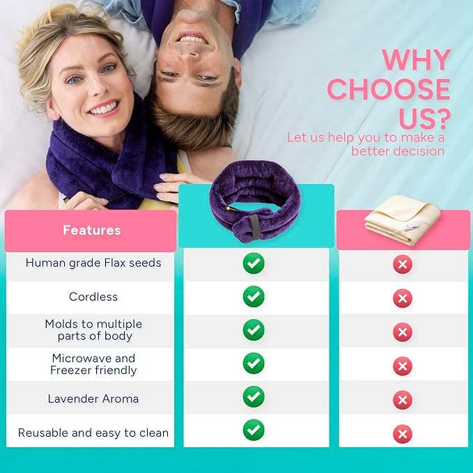 - WEIGHTED, MOIST PAIN RELIEF: Allow deep heat penetration via gentle compression of sore, swollen areas under the light weight of our microwavable neck wrap. Microwavable flaxseeds inside help maintain a moist surface, further enhancing heat radiation and effectiveness.