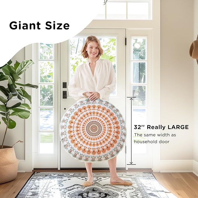 Codi Meditation Floor Pillow, Round Large Pillows Seating for Adults, Bohemian Mandala Circle Cushion for Outdoor Fireplace Yoga Living Room, 32 Inch, Memory Foam Added, Coral