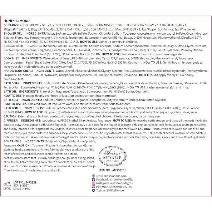 - NO RISK PURCHASE: We are confident that you will be happy with this Bath Gift Basket! However, if you still have any questions, please feel free to contact us, we will do everything we can to make it right! Thank you for choosing ArioseMonde