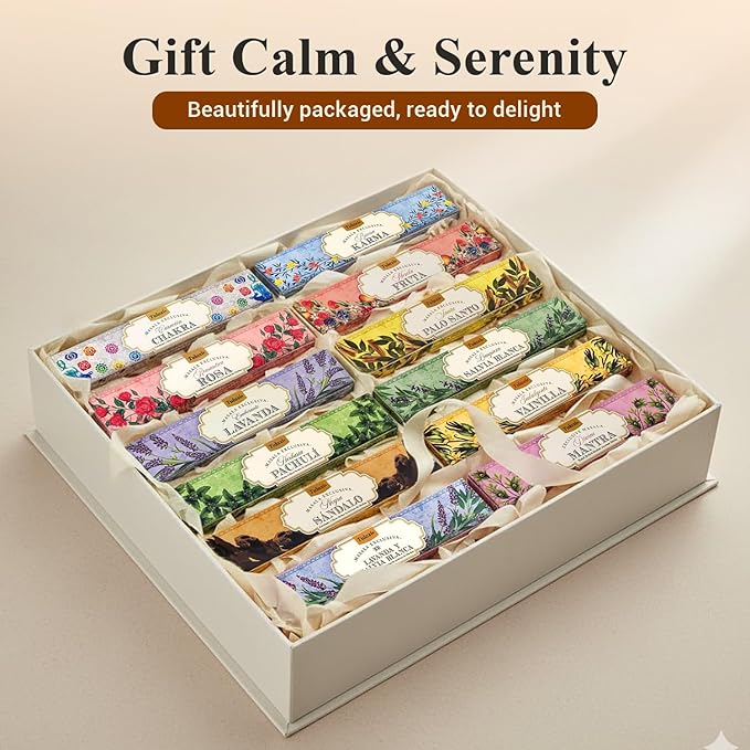 - SET INCLUDES: 180 incense sticks (12 x 15 Pc). This Tulasi Incense Stick Gift Pack includes 12 different fragrances boxes, each box contains 15 sticks | Romantic Rose, Lush Lavender, Lavender & White Sage, Herbal Patchouli, Cleansing White Sage, Divine Mantra, Good Karma, Mix Fruit, Holy Palo Santo, Indulgent Vanilla, Black Sandalwood, Healing Chakra