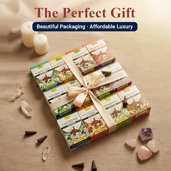 - SET INCLUDES: 120 incense cones (12 x 10Pc). This Tulasi Incense Cones Set includes 12 different fragrances boxes, each box contains 10 cones | Sandalwood, Musk, Vanilla, Citronella, Frankincense & Myrrh, Jasmine, Cinnamon, Lavender, Palo Santo, White Sage, Red Rose, and Patchouli