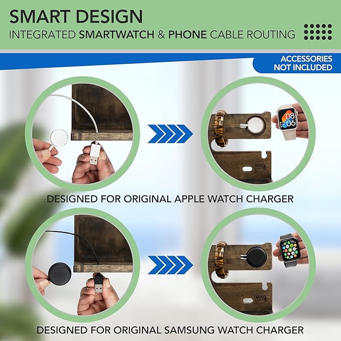 - Smart Cable Solutions - Our mens dresser organizer keeps your devices charged & tidy. It features a slot for an Apple or Samsung Watch charger, a cavity for your AirPods & hidden cable channels to tuck away cords. Keep your everyday carry items organized.