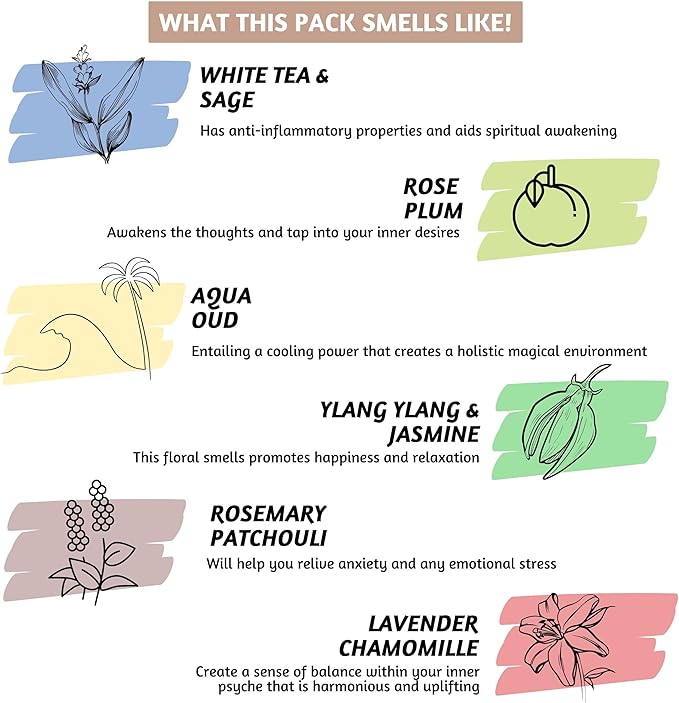 - Fragrance Note - This insence pack has a beautiful blend of mellow and relaxing fragrances such as white tea & sage incense, rose plum, aqua oud incense, ylang ylang 7 jasmine incense, rosemary incense, patchouli incense, lavender incense & chamomile incense. Be it in the meditation room, or bed room these incessant sticks impart an aromatic scent and a sense of calm.