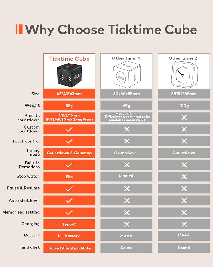- Multiple Timing Modes. The cube timer offers countdown, count-up & pomodoro modes. Besides the 8 preset countdown and custom countdown, you can start count-up mode by placing the timer bottom up, and stop it by standing the screen up. Pomodoro mode is activated by long-pressing the fingerprint icon on the number 5 side. The timer notifies you every 25 min of work and a 5-min break, to keep you focused and productive. The timer range is 00:01 to 99:59. Easy timer setup for maximum comfort.