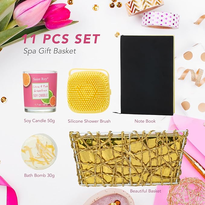 - [ 11 Pcs Luxury Spa Kit Gifts ] This birthday gifts bath basket for women has everything you needs. This Bath and Body Gift Basket includes Bubble Bath, Shower Gel, Bath Bomb, Bath Salt, Soy Candle, Hand Cream, Body Lotion, Bath & Body Oil, Nail Tool In Bag, Notebook, Silicone Shower Brush. Home Spa Kit to pamper yourselt time at home spa