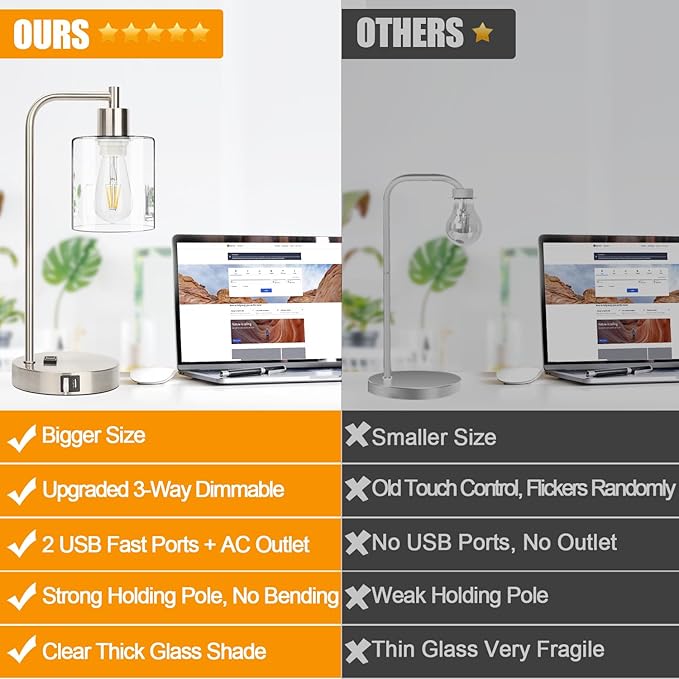 - Minimalist & Industrial Design - With the modern minimalist design concept, the set of 2 bedside lamps are bigger than others. Thick clear glass shade included. These touch control table lamps for bedrooms have strong holding pole, and they won't bend even if they fall down from the table.