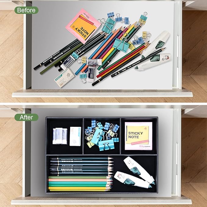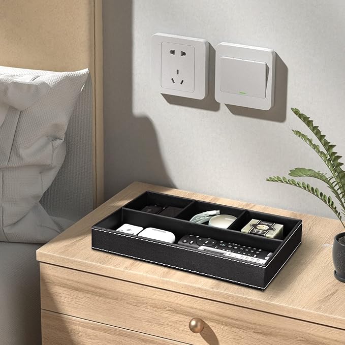 - Four Compartments for Perfect Organization: With four thoughtfully designed compartments, our nightstand tray organizer inserts allows you to neatly store your sunglasses, socks, ties, watches phones, wallets and showcase your rings, bracelets, earrings, and other precious accessories.