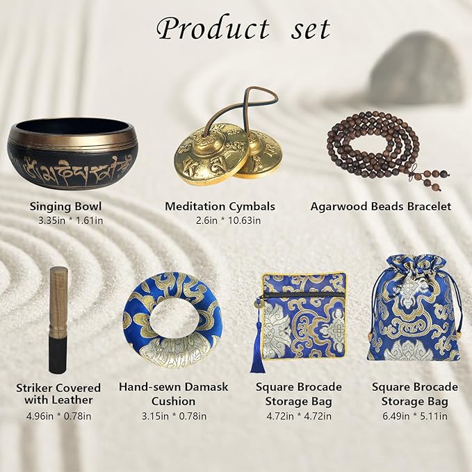 - COMPELETE SET: Singing bowl(3.35") x 1, a pair of meditation cymbals(2.6") x 1, agarwood beads bracelet x 1, hand-sewn damask cushion x 1, striker covered with leather(5") x 1, brocade storage bag x 1, square brocade storage bag x 1