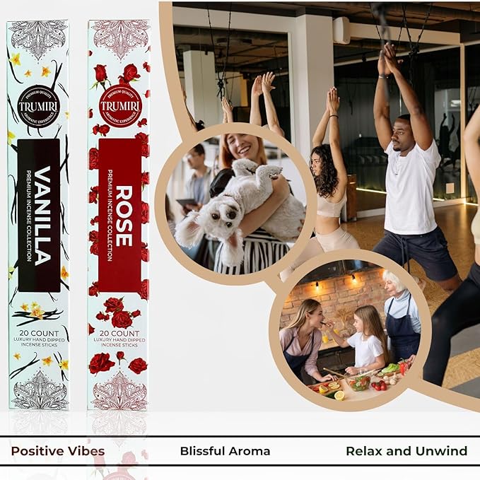 Trumiri Incense Sticks - Combo Pack of 40 Insence-Sticks - 20 Vanilla + 20 Rose - Insenses - Insents - Incents - Inscense - Incence - Incienso - All Natural Incense Sticks