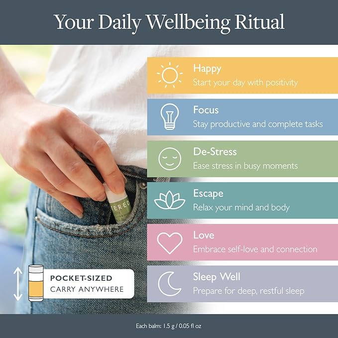 - Six Unique Balms for Every Moment – Includes mini versions of our signature balms: 'Sleep Well' for restful sleep, 'De-Stress' for relaxation, 'Focus' for mental clarity, 'Escape' for mindfulness, 'Happy' to uplift your mood, and 'Love' for emotional balance and support. Each balm functions as a compact essential oil inhaler and aromatherapy pen with soothing scents.