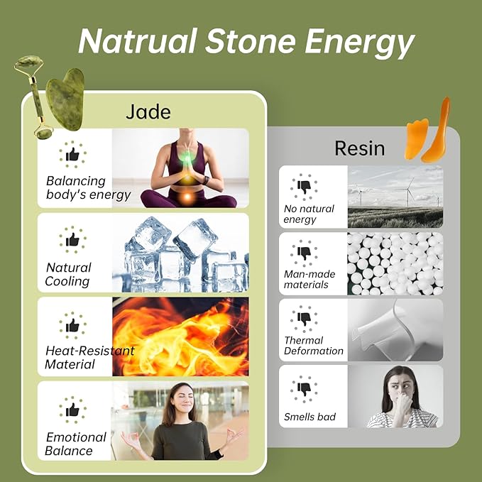 • 【Balancing Energy, Inside Out】Experience balanced minds and bodies with our real jade Gua Sha Scraping Massage Tool Set. Its magnetic energy calms minds, while the natural cooling effect after freezing can revitalize the skin again. Jade Gua Sha made of natural material is an ideal alternative to plastic guasha and ice rollers in skincare.