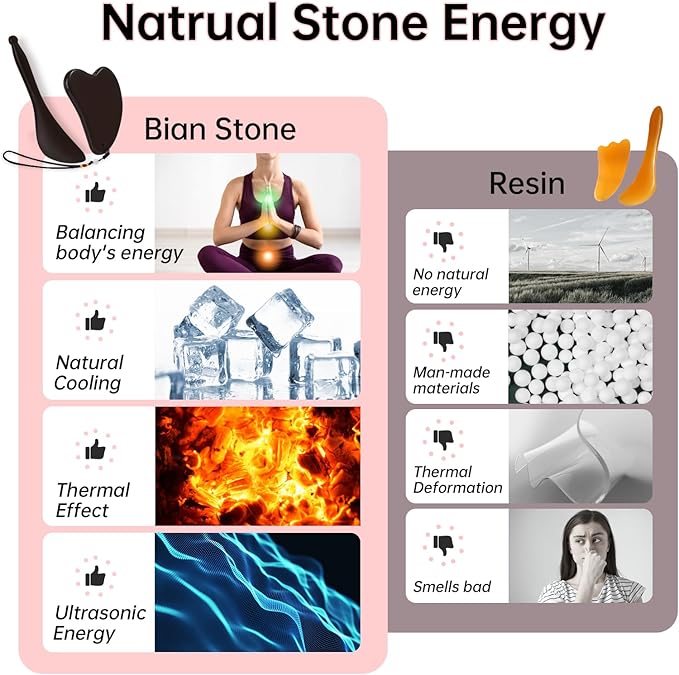 • 【Balancing Energy, Inside Out】Bian Stone Gua Sha Scraping Massage Tool is crafted from natural materials and enhances skin care with its thermal effect boosting blood circulation. Bian Stone's magnetic energy calms the mind. The natural cooling effect after freezing can better swelling. An ideal alternative to plastic Gua Sha and ice rollers for skin care.