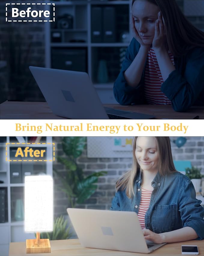 - 【10000 LUX & UV-FREE SUN LIGHT THERAPY LAMP】:Our full spectrum light therapy lamp emits 10,000 lux(max) mimetic natural light and UV Free, friendly to eyes and skin. 10,000 lux to illuminate your room 360° day and night,which boosting energy,reduce the fatigue of work, the stress of life and enhancing concentration, leaving you feeling energized.