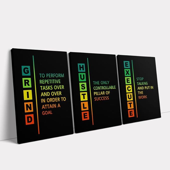 KAWAHONE Motivational Canvas Wall Art, Hustle Grind Execute Wall Art Decor, Black and White Positive Motivational Poster Framed Inspirational Entrepreneurs Painting Prints Quotes Poster for Office Workplace