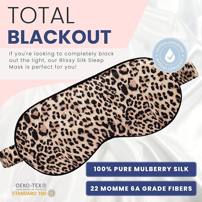 Blissy Silk Sleep Mask - Silk Eye Sleeping Mask for Women & Men for Total Blackout - 100% Pure Mulberry Silk, 22 Momme 6a Fibers - Blindfold Silk Sleep Mask Side Sleeper Eye Cover (Leopard)
