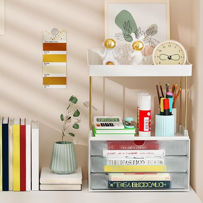 - Maximize Your Countertop Space: With two spacious shelves and three practical drawers, your entire skincare collection—from cleansers and serums to sunscreens—can be systematically arranged and easily accessed. This organizer is perfect for the bathroom counter, vanity, or even the kitchen.