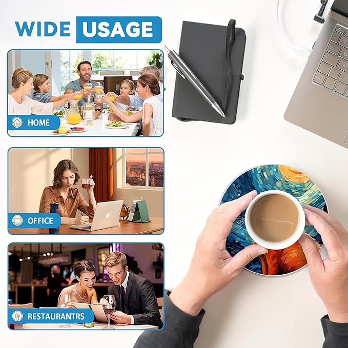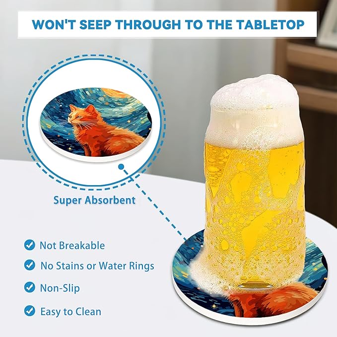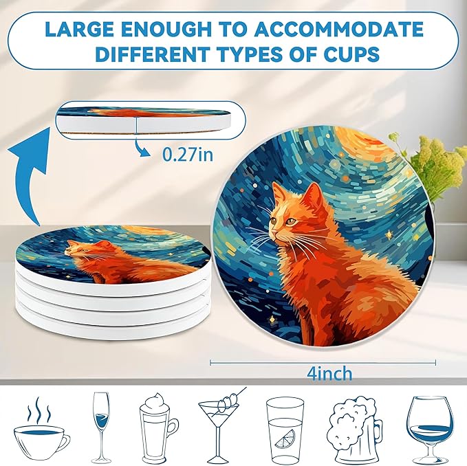 Starry Night Cat Coasters Set of 4, Round 4" Absorbent Ceramic Stone Coasters with Cork Base, Cute Table Home Decor, Ideal Gifts for Women Men