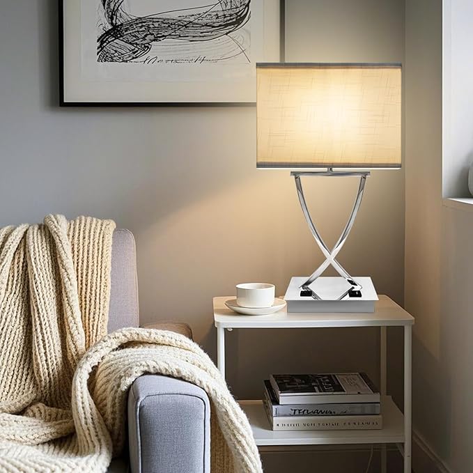 - 【MINIMALIST STYLE DESIGN】Table lamp for livingroom is made of high quality electroplated white chrome crafted body and white linen shade, which is not only beautiful but also can be more durable. It is suitable for any space, such as bedroom, office, hotel, baby room, guest room and so on. The base of the table lamp is specially weighted and equipped with non-slip pads to prevent tipping, sliding or moving.PS: (the lampshade needs to be assembled and can be completed in 2 minutes)