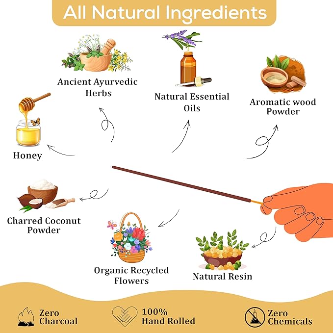- 100% NATURAL : Oud incense Sticks completely handmade MADE FROM SCRATCH by blending natural resins, Herbs, Spices with aromatic wood powders, charred coconut powder fragrant oils and honey.No Dipping in Toxic Chemicals.