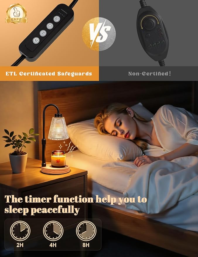- 【Dimmable Candle Warmer Lamp with Timer】Our controller features four brightness settings and a timer function, and comes with an ETL-certified switch for added peace of mind. You can adjust the brightness to control the speed at which the fragrance is released, tailoring it to your personal preferences. The timer function means you can leave home without worrying about forgetting to turn the candle light off