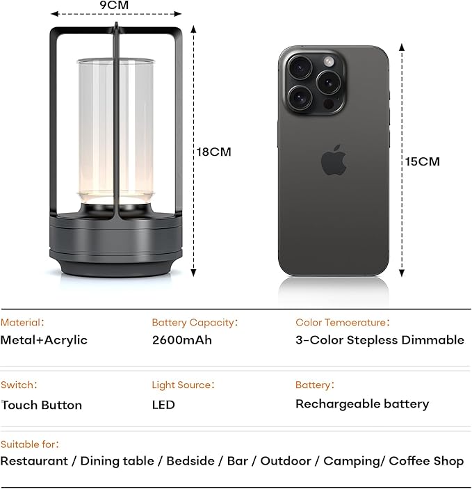 • ๐Ÿ’š [ A perfect gift idea ]: Our touch light lamp can match a variety of scenes and styles while making a great gift. It can be used as an ambient light for Thanksgiving, Christmas and birthday parties. The rechargeable cordless led table lamp is suitable for bedroom, bedside table, office, restaurant, cafe, bar, hotel, outdoor patio lighting, etc.