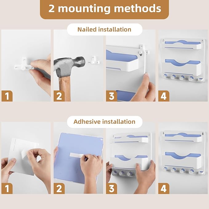 - Adhesive Nail and Nano Double-sided Tape Installation: The adhesive nail installation method can better protect your wall and allow the wall mount to withstand heavier weight (max 8 bl). The nano double-sided tape installation method allows you to follow the easy installation and stronger stickiness.