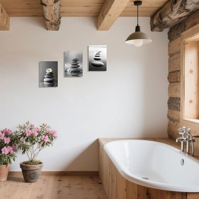 CCWORKERRY 3PCS Zen Stones Canvas Wall Art Black and White Zen Stone Painting Calming Meditation Wall Decor for Yoga Studio Office Spa Bathroom (gray,12W x16L x3)