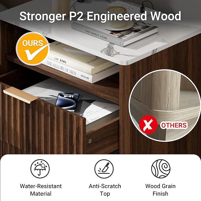 - 【Stylish & Practical Design】Favourlife nightstand features an elegant walnut finish on its surface, unique curved fluted panels as drawer decorations, a wide metal handle, and a faux stone patterned white tabletop for embellishment. Its chic design suits contemporary to mid-century styles perfectly, with sleek lines and rounded corners ensuring family safety while elevating any room's ambiance as a standout piece.