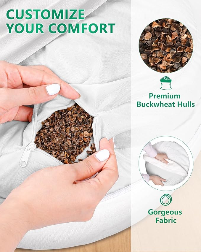 - Luxurious Cotton & Natural Buckwheat Filling: Features a soft, premium cotton cover for a plush feel and elegant look, while the natural buckwheat hull filling provides adjustable firmness and stable support for spine alignment