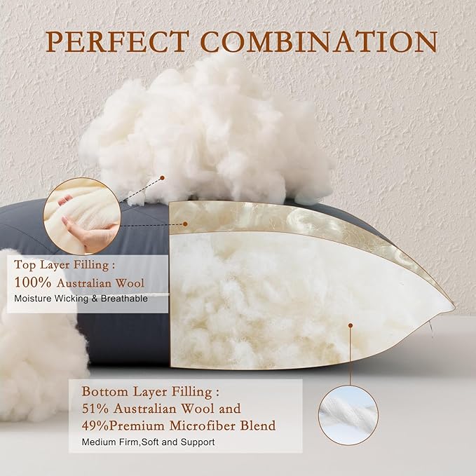 - 【Wool + Microfiber Filling, Double Comfort Support】The top of the pillow is filled with 100% natural Australian wool, and the bottom is filled with 51% Australian wool fiber and 49% microfiber mixed filling. It has both soft touch and good support, fits the curve of the head and neck, relieves pressure, brings a cloud-like comfortable experience.