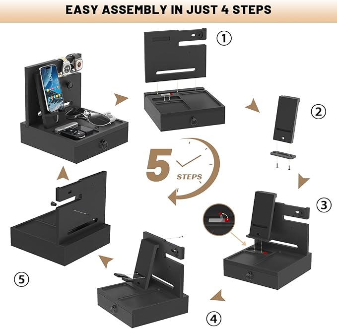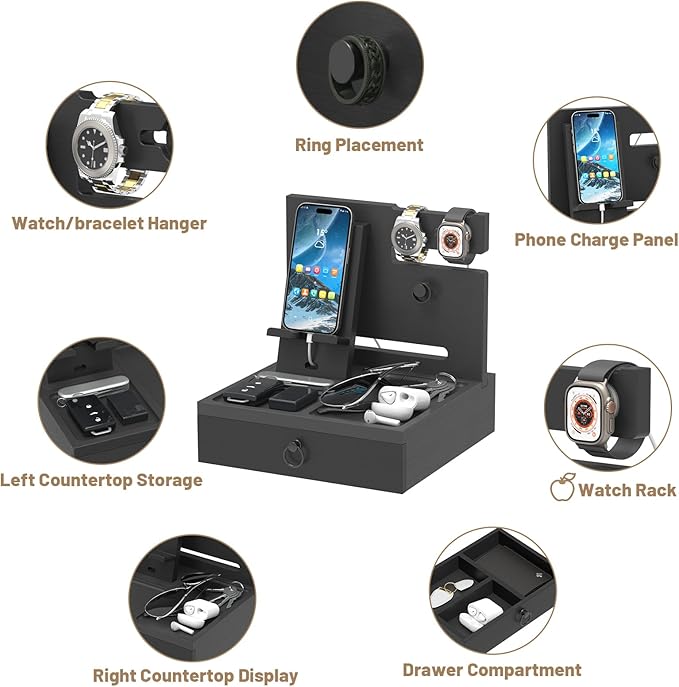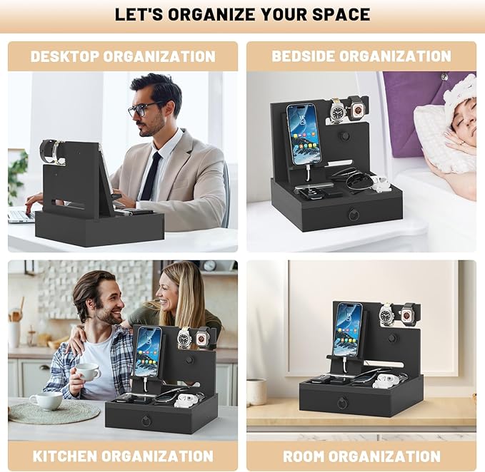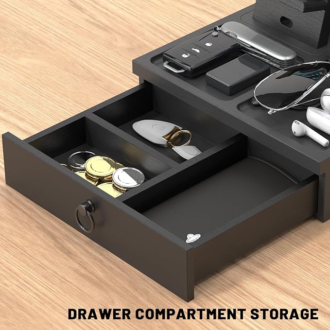 - Drawer Space for Storage: Our phone docking station not only charges electronics, but also provides space for organizing essentials. And this men's bedside organizer features a hidden, three-compartment drawer to easily store your small gadgets. Meet your daily needs.