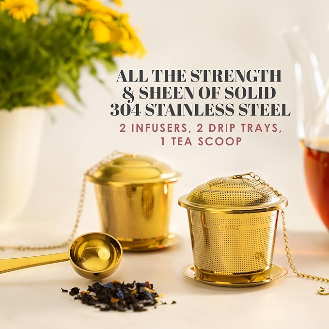 - ✔ LARGE CAPACITY – MORE TEA FOR EVERYONE: Set includes 2 tea infusers, 2 drip trays and 1 tea scoop. Now you can brew tea for you and your beloved ones or a houseful of friends. Instant refreshment!