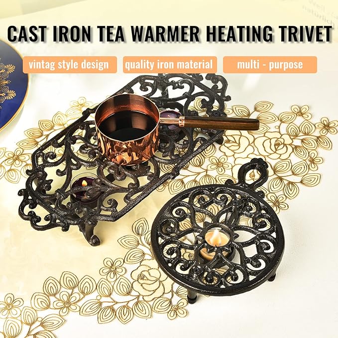 Sungmor Cast Iron Teapot Warmer Dish Cups Heater Pot Trivet - Rustic & Graceful Pattern Design with Tealight Holder - Heavy Duty & Decorative Candle Holder Stands for Heat Food Coffee Milk or Tea