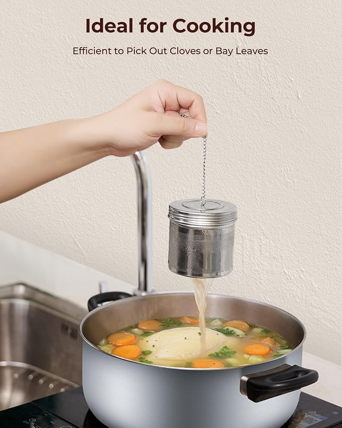 - Wide Application: Comes with 2 loose leaf tea infusers, one for making tea, the other one for cooking. With Extended 7.8'' chains with hook, the large tea steeper can catch securely on any rim of large pitcher, pan, pot, tea kettle or teapot. [Notice]: Ensure the diameter of your container is less than 3.2" to accommodate the infuser's lid diameter