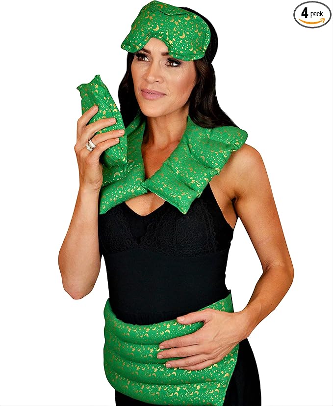 • AT HOME SERENITY: The full 4-piece set includes a wrap for the chest, neck, and shoulders, a belted lumbar wrap for the hips, abdomen, and lower back, an eye mask to relieve headaches and aching eyes, and an all-purpose aromatherapy pack