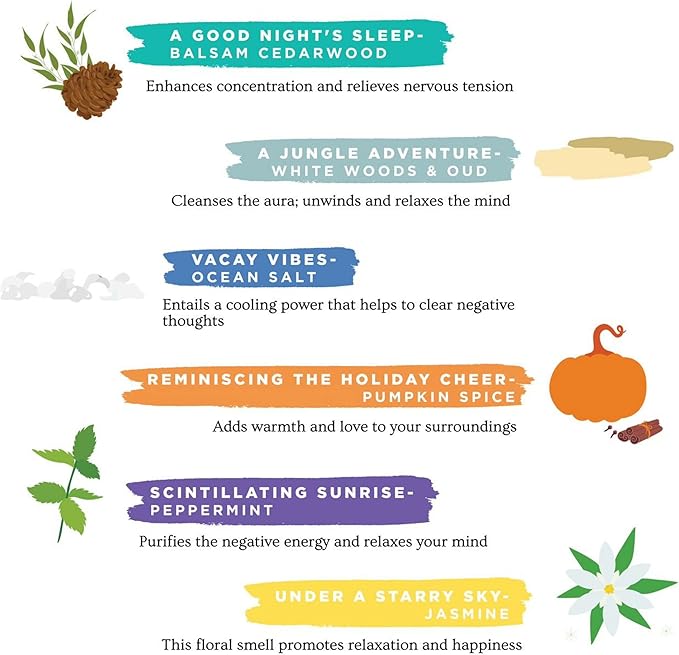 - Fragrance Notes – This incense pack combines uplifting woody notes with rustic undertones with fragrances like Balsam Cedarwood inscents, Jasmine incense, White Woods & Oud insenses, Ocean Salt, Pumpkin Spice Incense. Suitable for meditation rooms, bedrooms, living areas, and even office spaces.