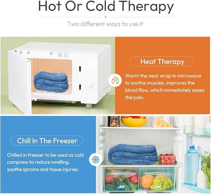- MULTIFUNCTIONAL HEAT OR COLD NECK AND SHOULDERS WRAP: Hot compress, warm the neck wrap in a microwave provides a warmth right where you need it. It also can chilled in freezer to be used as cold compress.