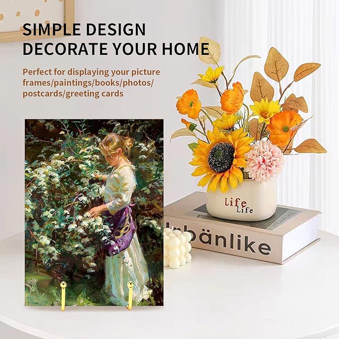 - Multi-functional -- These gold picture stand are very useful for painted tiles, canvases, decorative plates, picture frames, postcards, cookbooks, musical instruments and any other artworks. A good helper for kitchen, library, home, office, cafe, bookstore, showroom and etc.