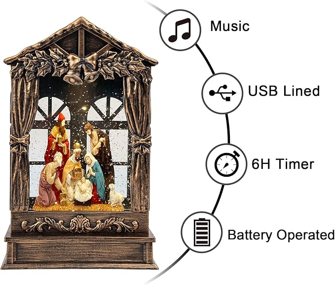 - ❄【Nativity scene】Three Kings Nativity scene Lighted Water Lantern Snow globe. When turned on a warm LED shines down on the figurine and swirling glitter to give our water lantern a whimsical look for the Holiday Season.