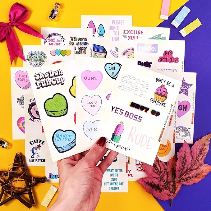 - STICKER SHEETS - Rude sticker pack contains several sheets. Sticker sheets are less likely to get damaged or bent compared to loose, cut-out stickers.