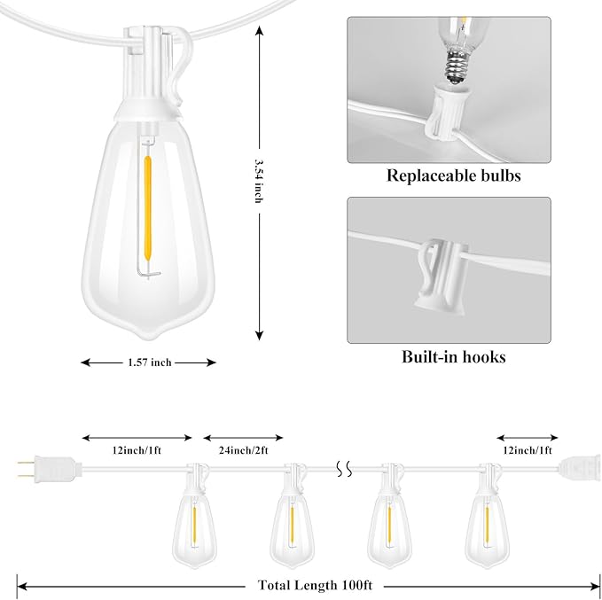 - 【Super Convenient and Widely used】 - It's a breeze to hang these led string lights with built-in hooks or zip ties. We even improved the hooks, sockets, and cords for you to use our string lights without facing the sudden breaking situation. These easy-to-use party outdoor string lights are fabulous decorations for your garden, Bistro, balcony, terrace, pergola, gazebo, tent, pool umbrella, cafe, bedroom, living room, market, wedding, birthday, Christmas party or other scenarios.