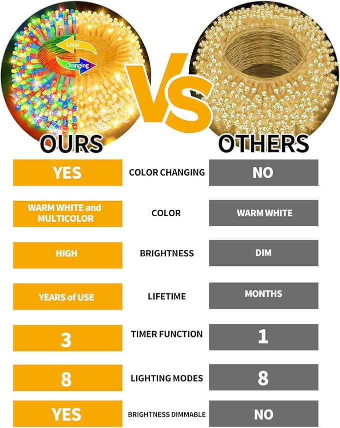 - 11 Lighting Options & Dimmable: Whether you prefer the Steady ON or the Twinkle lights, our versatile modes let you customize the ambiance—Steady On, Combination, In Waves, Sequential, Slo-Glo, Chasing/Flash, Slow Fade, and Twinkle/Flash. Also, have 4 levels of brightness, to meet your different needs for parties or other occasions. Perfect for setting the mood for Thanksgiving and Christmas holiday decorations