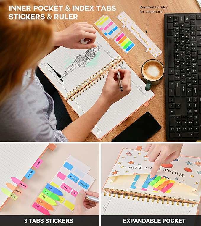 - 【Functional Accessories & Organizational Tools】This spiral journal notebook includes 1 pen holder that securely keeps your writing tool within reach, 2 elastic closure bands that protect your pages, and an inner pocket for storing small items like notes or receipts.3 index sticker tabs and one removable bookmark ruler assist in navigation.These features make it an excellent choice for school notebooks, or work notebooks, serving as a reliable spiral journal for college use.