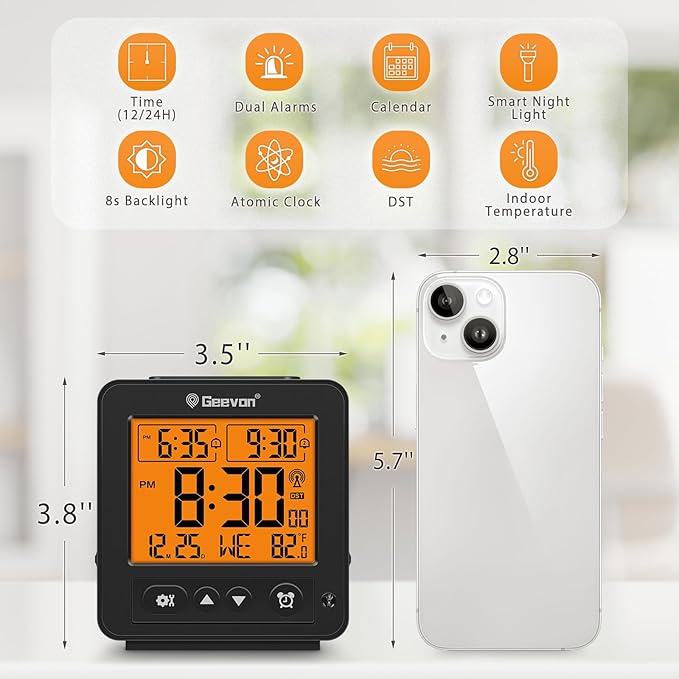 - [Multifunctional Table/Desk Alarm Clock] The Geevon smart night light digital alarm clock measures 3.5 (L) * 1.4 (W) * 3.8 (H) inches, small and light. It is an easy cordless battery powered alarm clock, powered by 2 AA batteries (not provided), features clear LCD display, atomic clock, calendar, smart night light, 8s backlight, 12 / 24-hour, indoor temperature.Basic bedside table alarm clock easy for kids, teens, adults to use