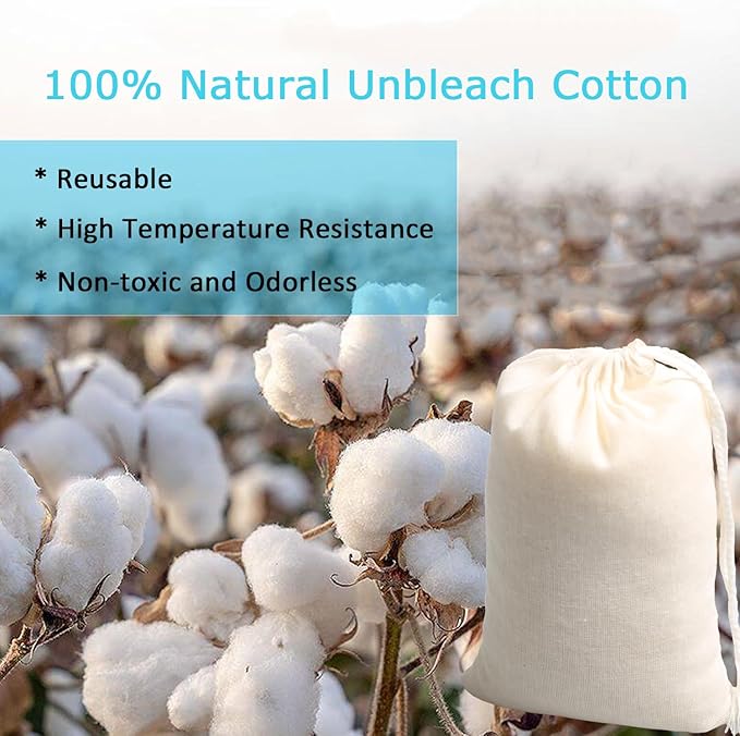 - Pure Natural Ununbleached Cotton: These spice bags are made from unbleached, food-grade cotton, tearing resistance, high-temperature resistance and odorless. Note: the tea filter bags have a few small black dots (cotton-seeds-hull) that won't fall off, due to the nature of pure natural ununbleached cotton.