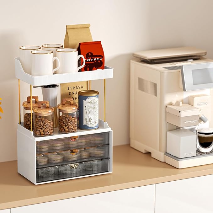 - Ugraded 2-Tier 3-Drawer Bathroom Counter Organizer: Unlike other makeup organizers that only feature 2 drawers, ours offers an enhanced storage capacity. The top two layers can accommodate perfumes, skincare products, and face creams, while the three drawers are perfect for storing eyeshadow palettes, sunscreens, and more.
