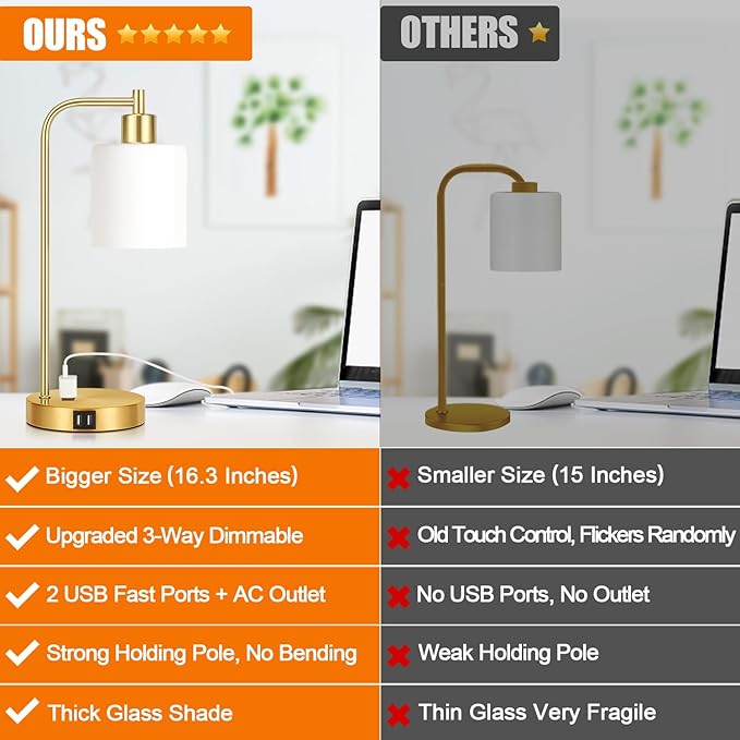 Set of 2 Industrial Touch Control Table Lamps with 2 USB Ports and AC Outlet - 3-Way Dimmable Gold Bedside Lamps Nightstand Desk Lamps for Bedroom Living Room, Opal Glass Shade & 2 LED Bulbs Included