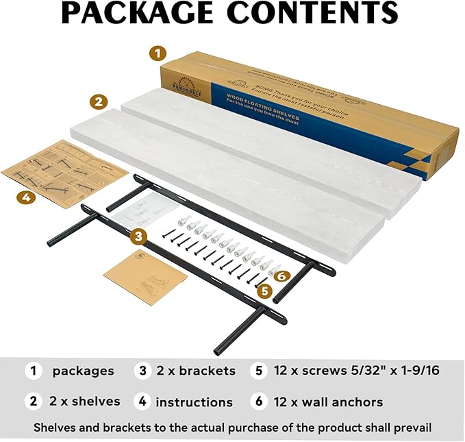 • EASY TO INSTALL: These floating shelves come with stainless steel galvanized invisible brackets, toggle bolts for drywall, and simple instructions to help you install them. These wall shelves are easy to assemble, requiring only two boards and the necessary screws and hardware. We also provide detailed instructions for quick and easy assembly
